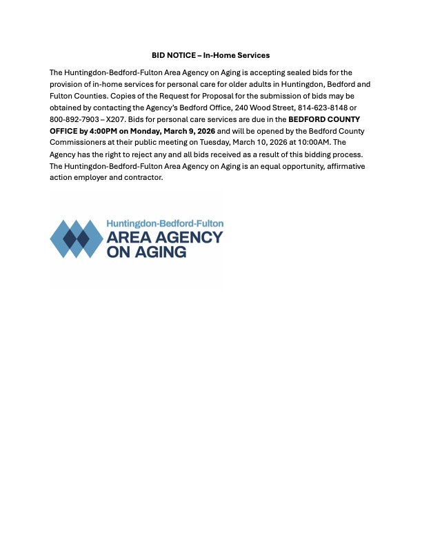 Huntingdon-Bedford-Fulton Area Agency on Aging (HBFAAA) is dedicated to serving the needs of seniors throughout all of Bedford, Fulton, and Huntingdon County, PA. Through offices in each county, we offer a wide range of programs and services designed to address the anticipated and emergent needs of our aging population with dignity and compassion.